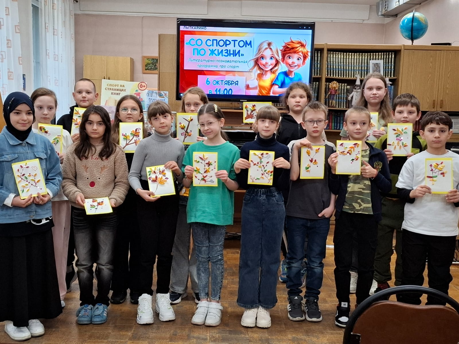 Во время осенних каникул в Детской библиотеке 6 октября прошло литературно – творческое мероприятие «Со спортом по жизни» для учащихся 4 «ББ» класса школы №2.Современный мир требует от наших детей не только знаний, но и умения справляться с жизненными трудностями, находить друзей и уверенно идти к своим целям. Занятия спортом — отличный способ помочь им в этом. Спорт – это не просто физическая активность. Он закладывает основы для будущих успехов в учёбе, работе и личной жизни. Школьникам провели познавательную викторину и рассказали о популярных видах спорта, которыми можно заниматься в нашем городе. Это футбол, фигурное катание, баскетбол, спортивное ориентирование и другие виды спорта. Во время мероприятия ребята приняли участие в физкультминутке, показав свои упражнения из утренней зарядки.После беседы про спорт и познавательной викторины школьники приняли участие вмастер – классе «Осенний калейдоскоп», где в технике граттаж сделали красивую открытку.Для мероприятия была подготовлена книжная выставка «Спорт на страницах книг».