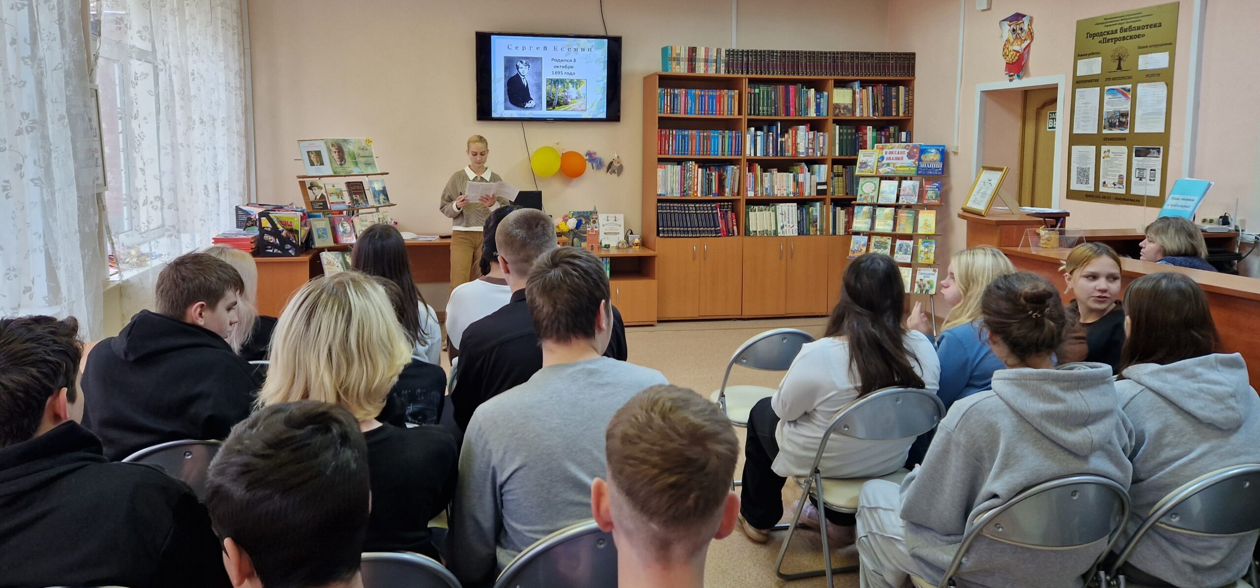 15 октября в детской библиотеке (детско-юношеском отделе «Петровское») для учащихся 9 «П» класса гимназии №4 прошёл литературный час «Мир есенинского образа», посвящённый 130-летию со дня рождения С. А. Есенина. Библиотекарь рассказала ребятам о жизни и творчестве поэта, о главных темах его поэзии: теме родной природы, дружбы, любви. Прозвучали такие стихи, как «Письмо матери», «Русь», «Письмо женщине», «Клён ты мой опавший». Ребята узнали интересные факты о детстве и семье Сергея Есенина, о творчестве, об особенностях лирики, о личной жизни и трагической гибели поэта. Посмотрели документальный видео-ролик с мамой поэта, где она рассказывала о его детстве. К этой дате в читальном зале детской библиотеки (детско-юношеском отделе «Петровское») оформлена одноимённая книжная выставка. На которой представлены собрания сочинений, стихотворные сборники и поэмы, а также книги исследователей, посвященные жизни и творчеству поэта.