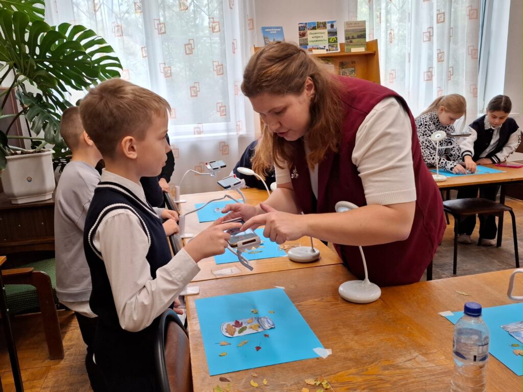 После интересного познавательного рассказа об осени педагог школы №2 Крылова Ирина Вадимовна провела для ребят мастер – класс по мультипликационной анимации, используя осенние листья.