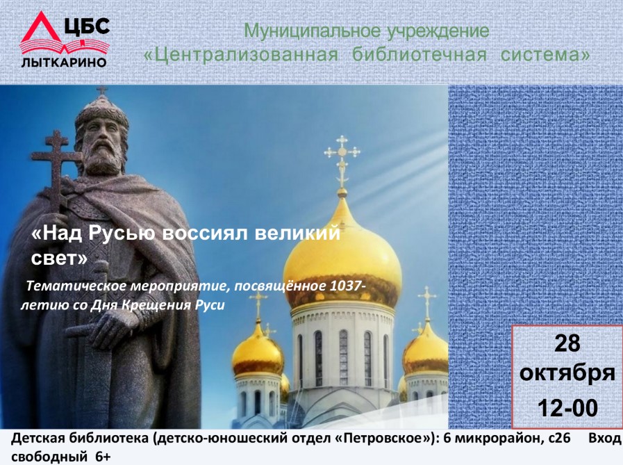 Дорогие друзья и любители истории! Приглашаем вас в детско-юношеский отдел «Петровское» Детской Библиотеки на тематическое мероприятие к 1037-летию со Дня Крещения Руси.